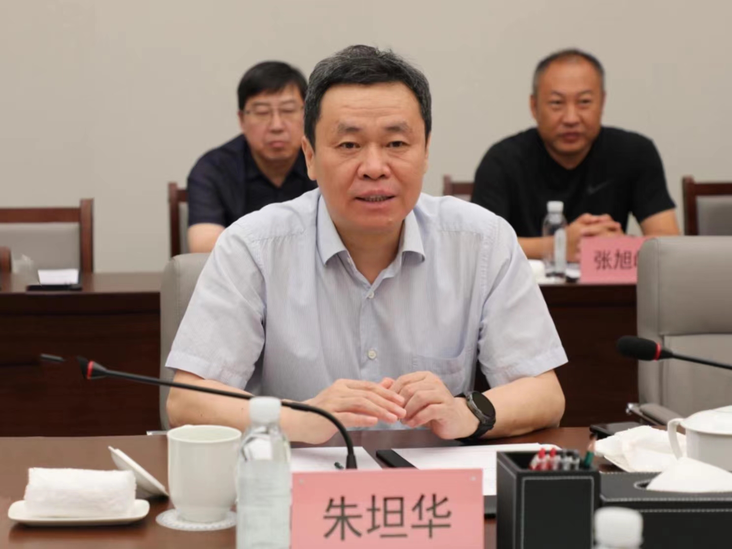 會前,朱坦華一行參觀了中國物流集團科技創(chuàng)新展、調(diào)度中心。軌道集團對數(shù)字鋼軌建設成果、數(shù)字質監(jiān)應用情況進行了專題匯報。